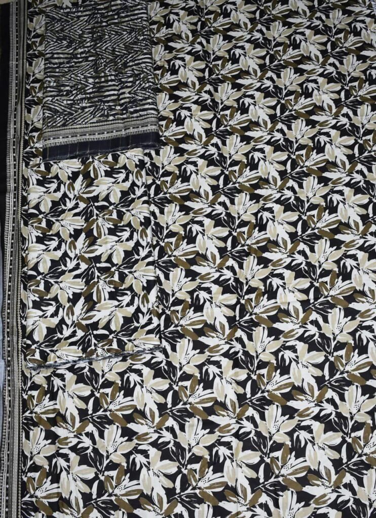 Bin Saeed Lawn 3-Piece Suit | Black and White Leaves Print with Stripe Dupatta