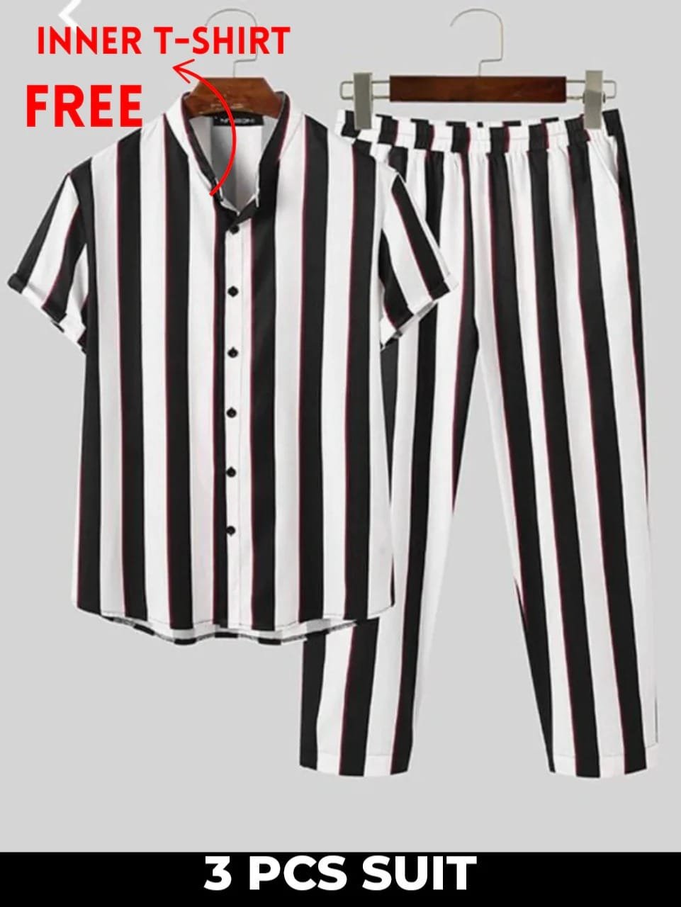 Men’s Stylish Black & White Striped 3-Piece Suit | Comfortable & Trendy Casual Shirt, Joggers & Free T-shirt