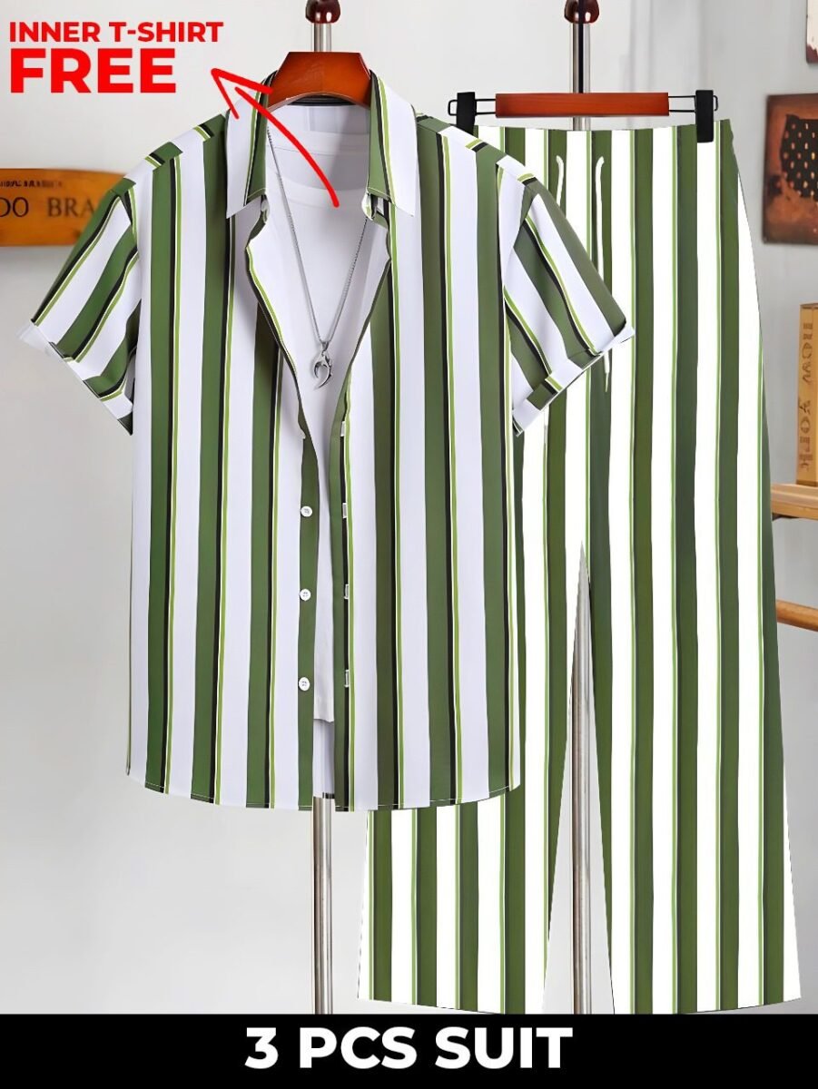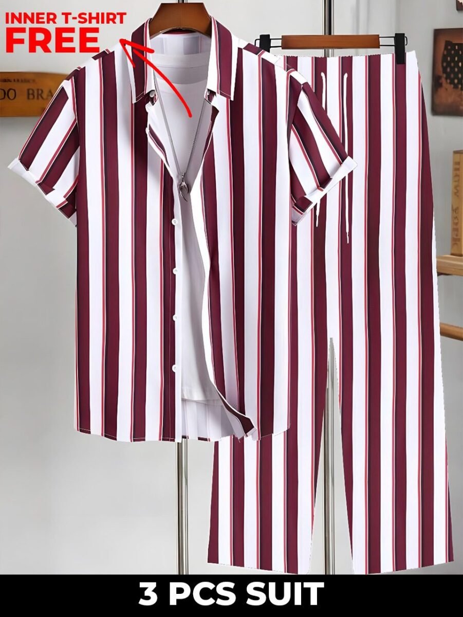 Men’s Stylish Black & White Striped 3-Piece Suit is the ultimate outfit for men who want both style and comfort in one package. This 3-piece set includes a striped casual shirt, matching joggers, and a free plain T-shirt, giving you a complete outfit ready for everyday wear, gym sessions, or casual gatherings.