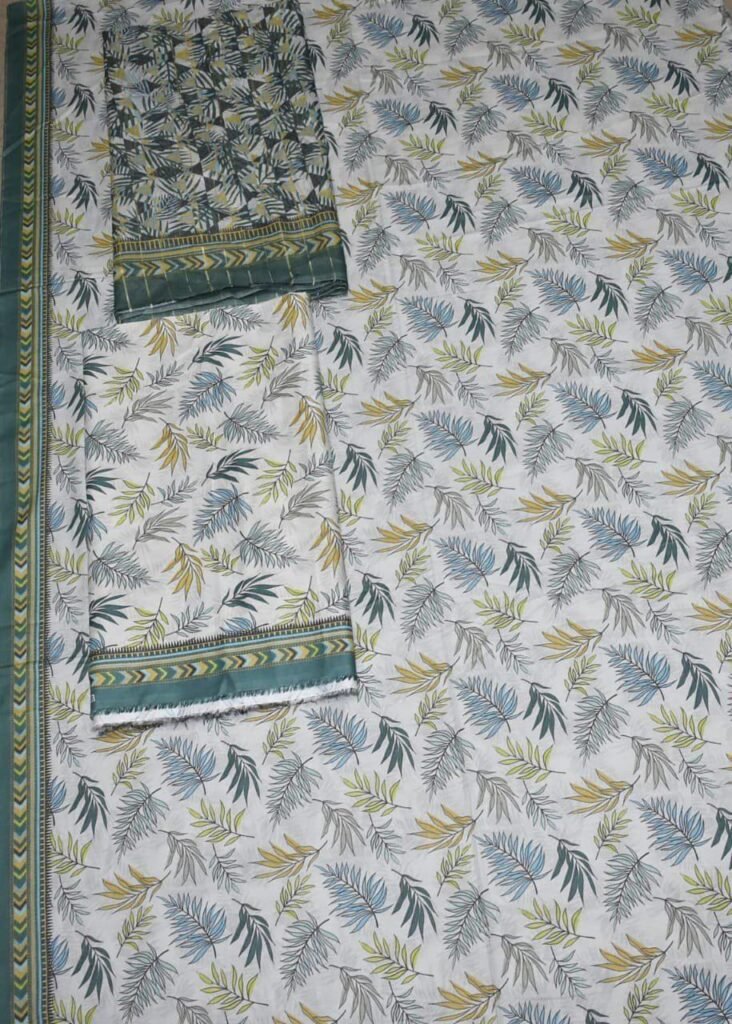 Bin Saeed Lawn 3-Piece Suit | White Printed Lawn Fabric with Green and Blue Leaves