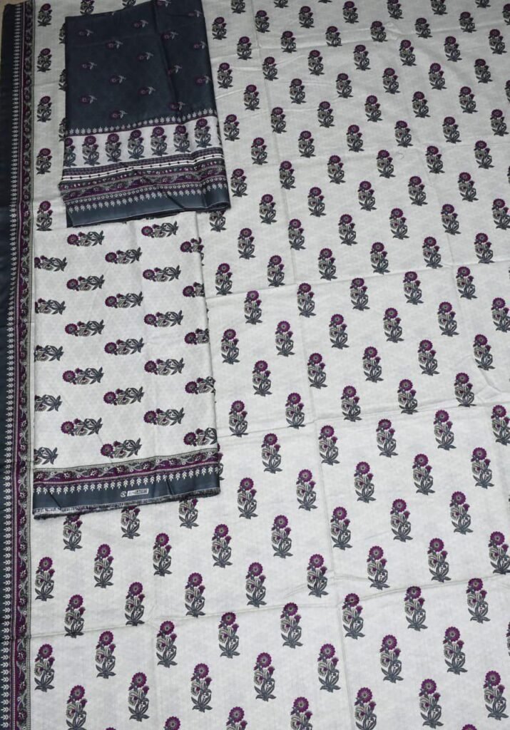 Bin Saeed Light Grey Lawn 3-Piece Suit Unstitched | Purple Floral & Geometric Print Fabric